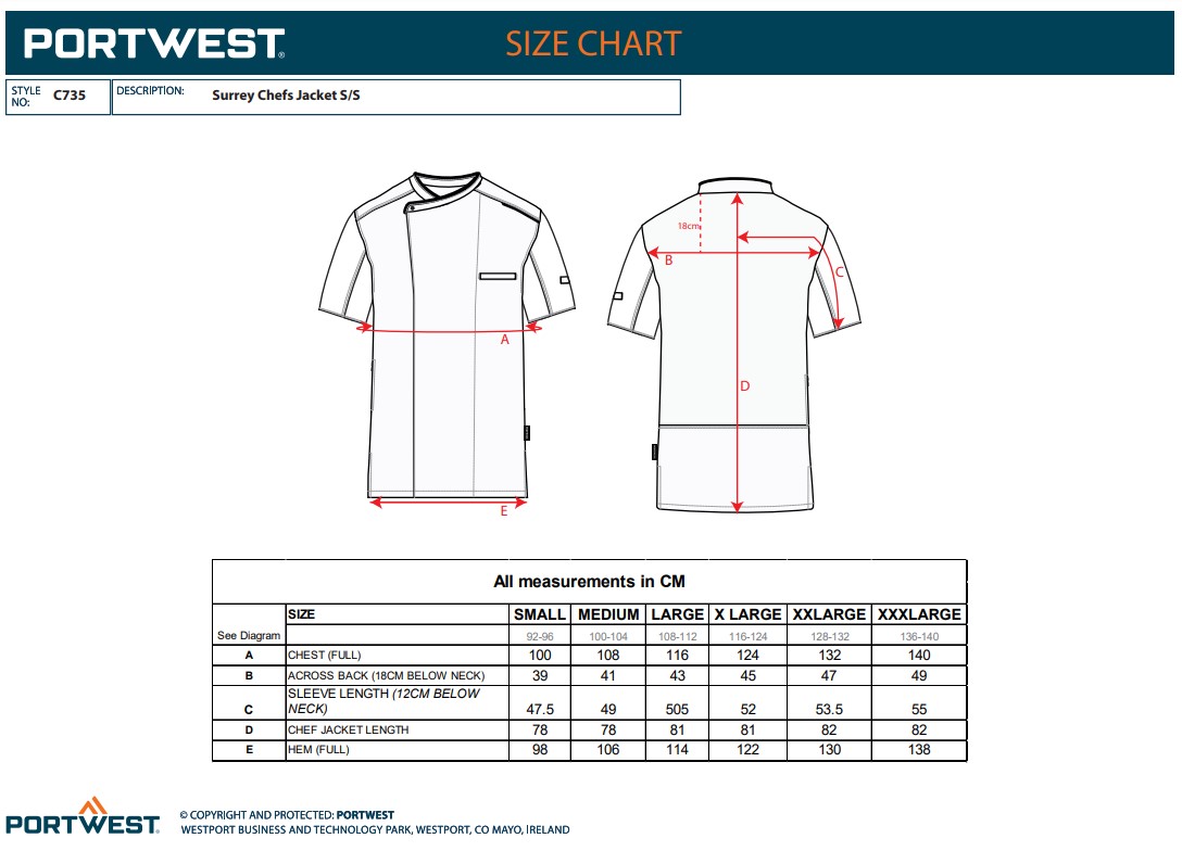 Portwest C735 Surrey Chefs Jacket S/S C735